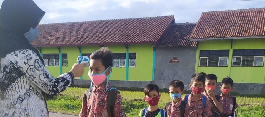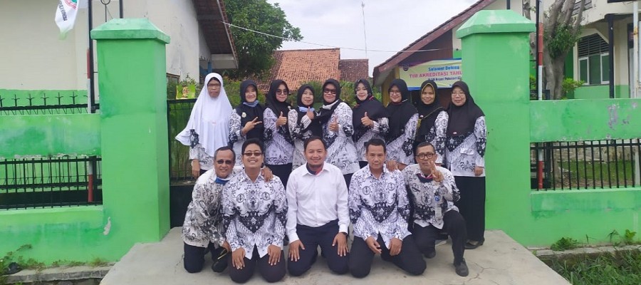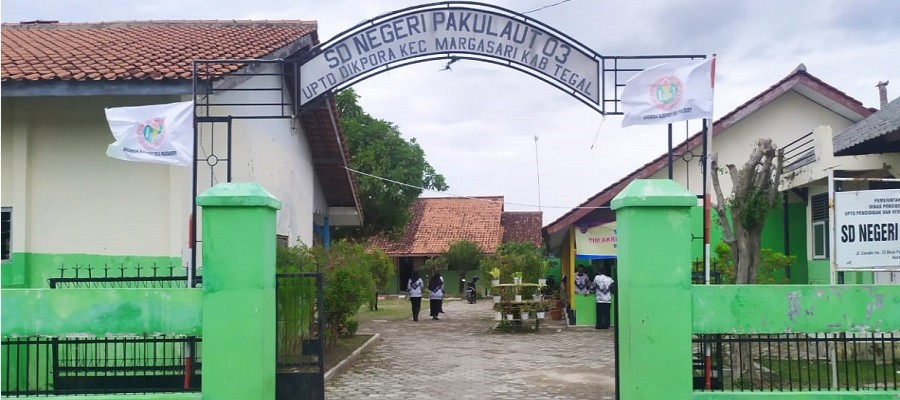 Guru dan Staf SDN Pakulaut 03, Kecamatan Margasari, Kab. Tegal berpose di depan gerbang sekolah SDN Pakulaut 03 yang sudah ditetapkan sebagai sekolah penggerak.